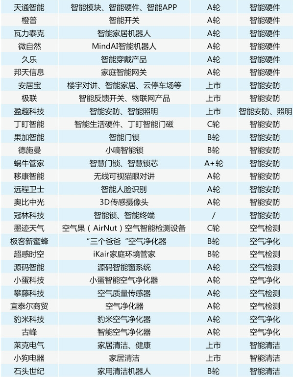 与争夺家庭场景的控制权相比,智能家居单品看起来门槛更低、竞争也没那么激烈。但事实并非如此,智能硬件、智能安防和空气检测领域也有不少创业公司出现。智能硬件企业中,不乏像青米科技、小鱼在家、猎户星空等找到“爸爸”的创业公司,安防企业中,也有像极联、蜗牛管家等实力雄厚的创业公司。