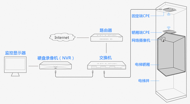 如上图,在电梯井内安装电梯监控专用CPE无线套装,取代传统有线线缆,省却大量布线工作。方案采用NVR(硬盘录像机)集中管理所有摄像机。